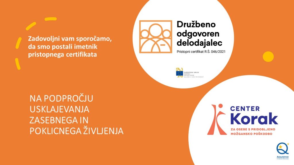 Center KORAK, Kranj je ponosen prejemnik naprednega certifikata 1 za Drubeno odgovornega delodajalca na podro?ju usklajevanja zasebnega in poklicnega ivljenja. Certifikat Drubeno odgovoren delodajalec